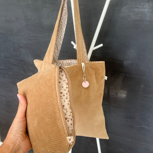 SET Tote bag velluto a coste cammello con Pochette abbinata